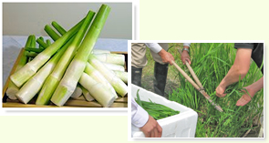 ・食 用 芽(菰菜)、マコモタケ(肥大茎)、実(菰米・ 種実)。
